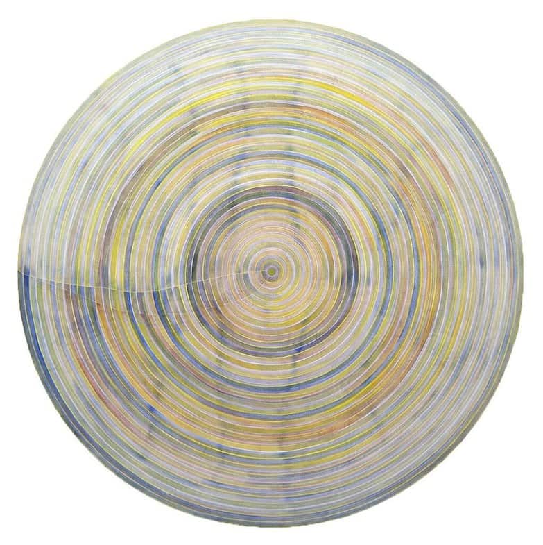 This series of large circular paintings is a study in color processization. Using the premise of painting exclusively with primary colors – the traditional primaries of red, blue and yellow painted in a circular and ordered pattern of layers – striking differences, depths and a range of colors are created. Each ring is painted in one sitting, a single rotation of the circle without interruption. The circular shape of these paintings, a universal meditation on wholeness, timelessness and the cyclic nature of life continues a multi-year exploration of this subject.